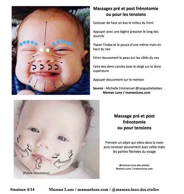 pour le frein de langue, avec un doigt ou deux, selon ce que la bouche de bébé permet, on passe sous la langue (par le côté, c’est plus facile) et on va, de chaque côté du frein, faire une vague d’avant en arrière de la langue au plancher buccal et inversément afin d’assouplir le frein et toute la région autour (cet exercice sera très important pour que le frein ne se reforme pas après la frénectomie et c’est mieux que bébé y soit habitué). Bien sûr cela se fait en douceur et sans lui créer de douleur. On le fait 2-3 fois et on retire le(s) doigt(s). On rejoue un peu avec la langue et on recommence les vagues pour en faire, en tout une dizaine, mais pas en une seule fois, ce qui est trop contraignant pour le bébé.